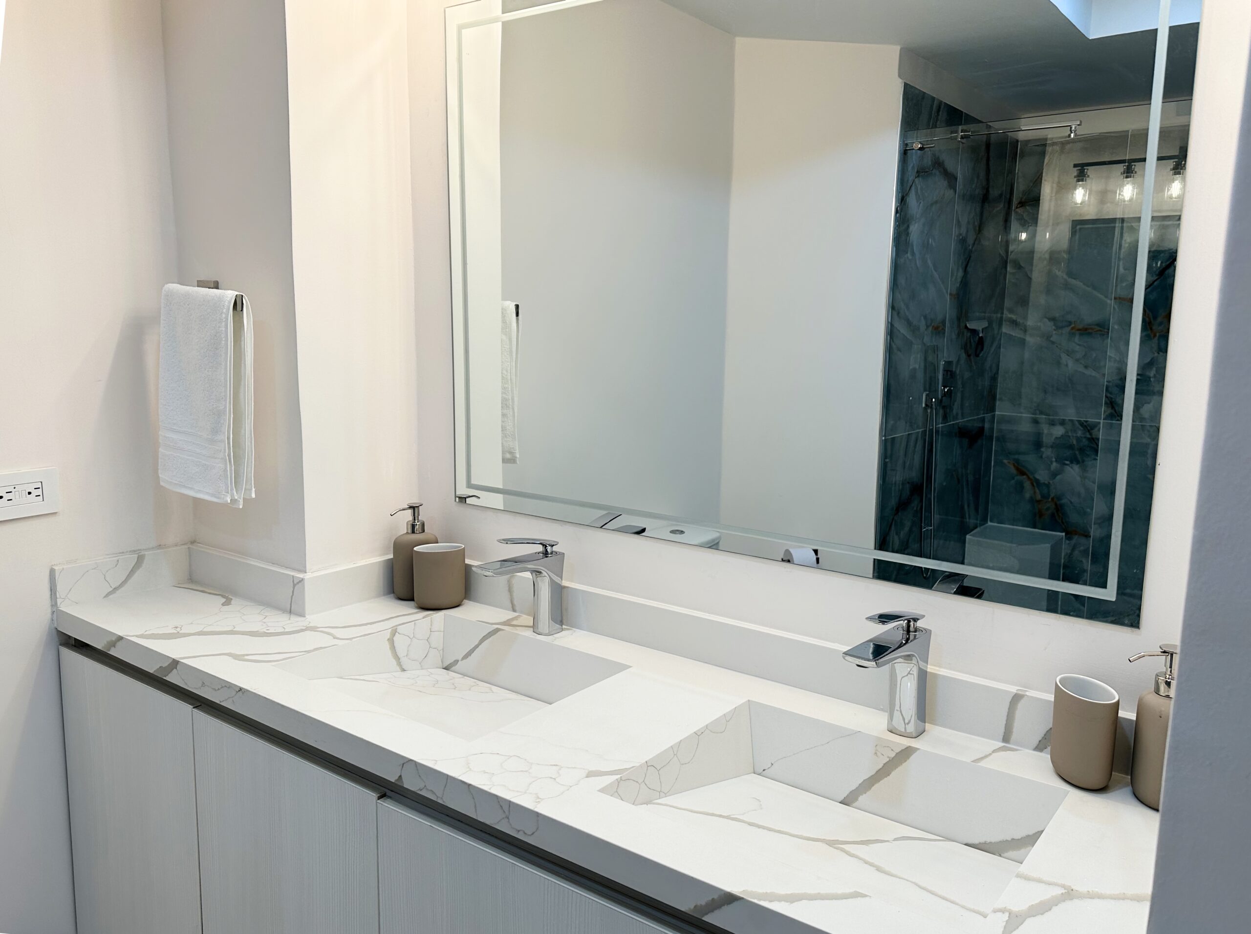 The first floor has a full kitchen, laundry, and a half-bath. The open-plan social area includes a 75” smart TV and a dining table for 8. Pluses are a large balcony with outdoor dining for 6 and a comfortable private office with a daybed. Work wired or on wifi connected to symmetrical fiberoptic internet at gigabit speed.